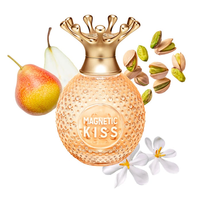 Au départ, une poire croquante et juteuse taquine une fleur d’oranger lumineuse. S'ensuit au cœur l’embrasement d’un duo d’iris racé et de jasmin sur une danse orientale et enivrante. En fond, la fragrance se pare de ses plus beaux atouts et révèle la saveur de la pistache grillée et d'une vanille ronde et charnelle. Le parfum Magnetic Kiss est une ode à la sensualité féminine : addictive, joueuse et hypnotique, elle déploie son aura dans toute son intensité.